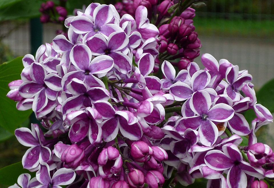 Сирень Сенсация – декоративный кустарник с густой темно-зеленой кроной и красивыми пирамидальными соцветиями. Его отличительной особенностью являются двухцветные лепестки, светло-фиолетовая окраска которых гармонично сочетается с тонкой белой каймой по краю. Цветки отличаются большим размером (до 2,2 см в диаметре), имеют трубчатое строение, состоят из 4 лепестков и формируются в крупные соцветия-метелки шириной до 8 см и длиной около 20 см. Цветение пышное и очень густое, при этом цветки распускаются не одновременно, а друг за другом. Каждый из них цветет на протяжении 9–12 суток, срок жизни одного соцветия составляет 13–19 суток, а весь куст может цвести в течение месяца.