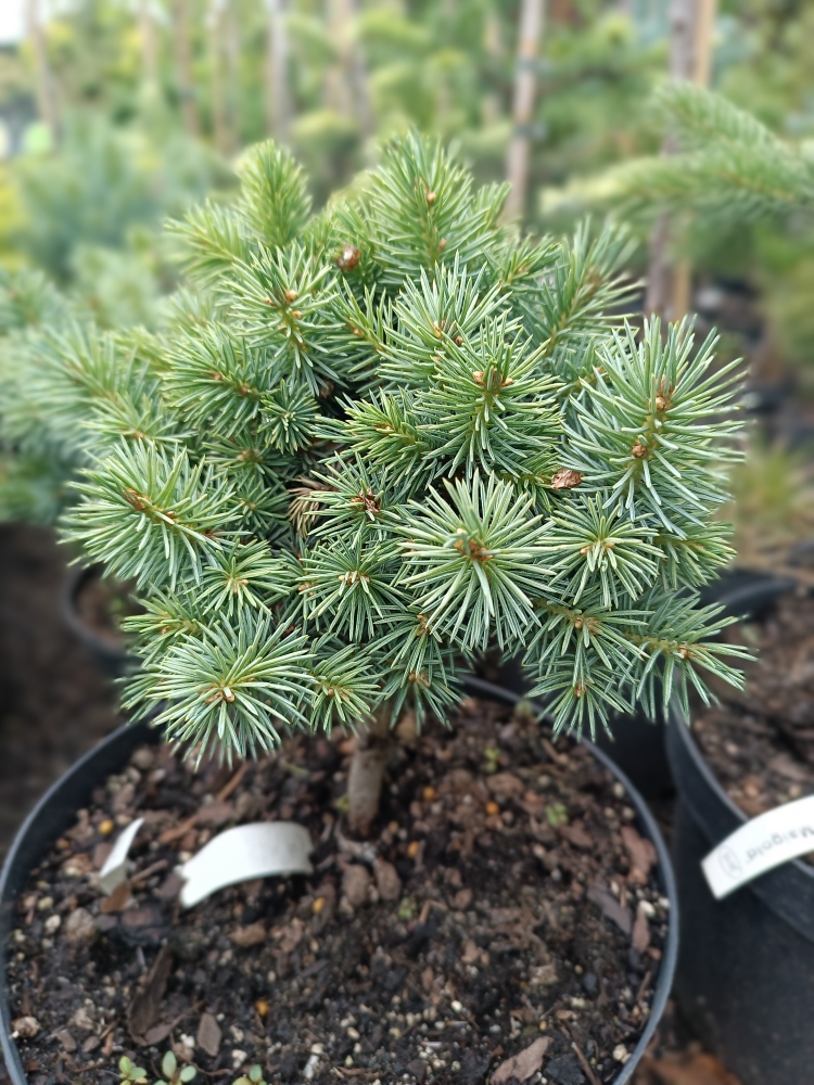 Ель колючая Брунек - карликовая декоративная форма ели колючей, возникла как генетическая мутация саженца видовой ели колючей. Хвоя .стального-синего цвета с восковым налетом, особенно насыщенный и яркий зимой.Неприхотливая и некапризная ель не требует к себе много внимания. Форма кроны шаровидная, компактная, очень плотная. Высота взрослого растения 0,8 м, ширина 0,8 м. В десятилетнем возрасте ель «Брунек» представляет собой шар, высотой и диаметром 35 сантиметров. Великолепно подходит для небольших садов как в составе композиций, так и просто для участков компактных размеров в одиночной посадке.