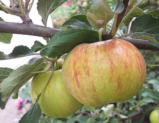 Плоды выше средней величины ( масса 115 г.), правильной округло- конической или плоско- округлой формы, слабо-ребристые. Кожица плотная, гладкая, транспортабельность плодов высокая. Основная окраска зеленовато-желтая, покровная - в виде красных широких полос на большей части плода.